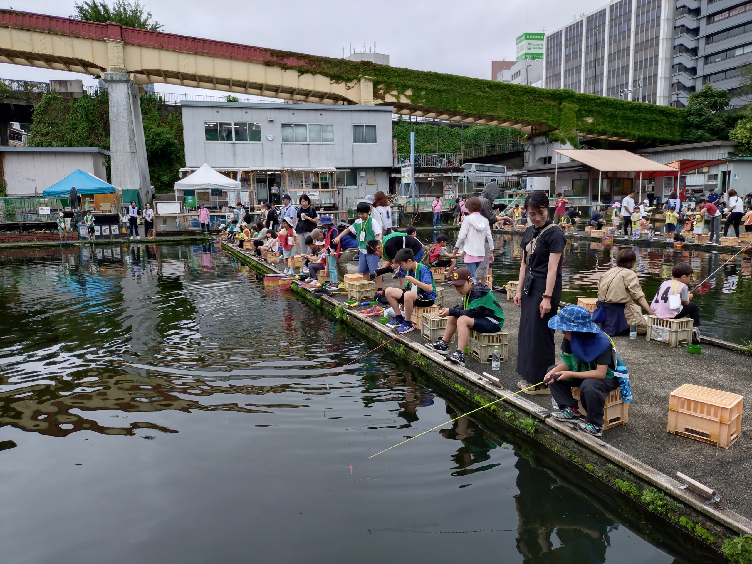 早朝にはだいぶ雨が降っており微妙な状況でしたが、9時には雨が上がり無事に開催されました。早稲田小学校、鶴巻小学校、江戸川小学校、牛込仲之小学校の子どもたち95名が集まり集中して鯉を釣りを楽しみました。早稲田大学のボランティアも5名大会のお手伝いをして頂きました。1時間30分の制限時間内に1匹も釣れない子もいましたが、中には1人で10匹釣った子もいました。